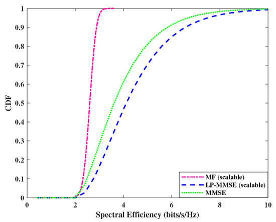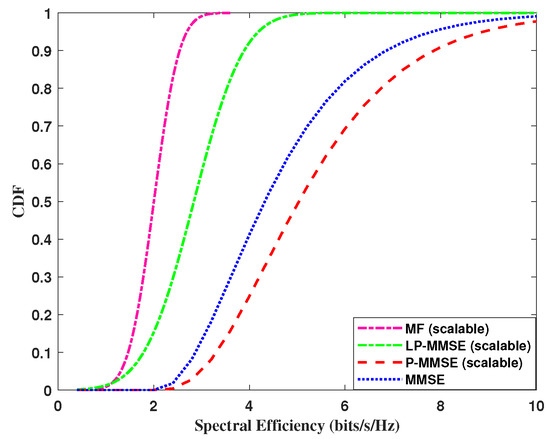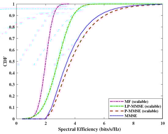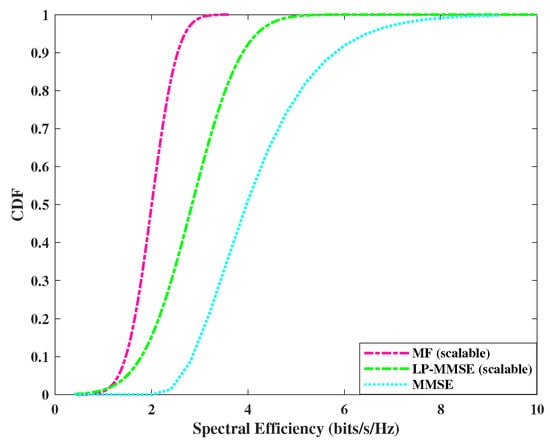 Next, we analyzed the performance of the uplink per user spectral efficiency, using the expression in Equation (19). The cumulative distribution function (CDF) of DCC with angle-based precoding schemes including MF, MMSE, and scalable LP-MMSE are compared for the two scenarios and are shown in Figure 5 and Figure 6. In our case, the angle-based MF scheme shows improved performance over simple MF; however, its performance is still not on par with the angle-based LP-MMSE scheme. It is evident from Figure 5, that the scalable LP-MMSE outperforms both MF and MMSE schemes. The LP-MMSE scheme gives a significant improvement in spectral efficiency for of the UEs, and its performance for the remaining weak-channel condition users is still better compared to its MF counterpart. In addition, it is also shown in Figure 5 that FDD-based cell-free provides improved spectral efficiency in the scenario where the number of antennas per AP is higher, compared to the case in Figure 6, because of the increase in spatial diversity gains with angle-based beamforming. The gap in the performances of MF vs. LP-MMSE and MMSE vs. LP-MMSE is significant, where the latter is even greater, which endorses that our proposed scalable LP-MMSE scheme is the better choice for FDD cell-free network. In Figure 6, this performance gap reduces for with the decrease in number of antennas per AP.