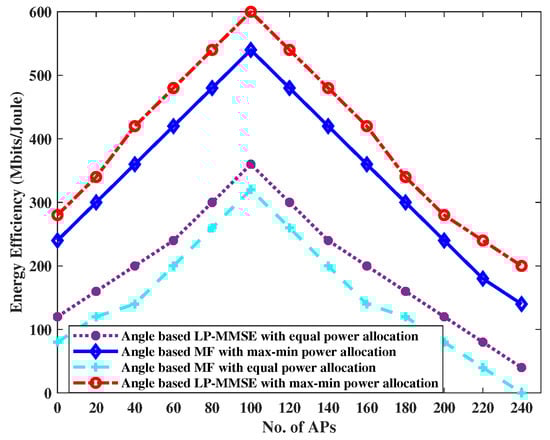 The energy efficiency versus the number of APs for an FDD-based cell-free network is compared and presented in Figure 9. We only considered the energy efficiency for scalable angle-based MF and LP-MMSE schemes with max–min power allocation versus equal power allocation algorithm. It is shown in Figure 9 that max–min power allocation algorithm gives a significant improvement in energy efficiency in both angle-based MF and angle-based LP-MMSE schemes. With the increase in the number of APs, there is a decrease in the number of antennas per AP, to keep constant over the coverage area. As a result, the energy efficiency starts to increase due to an increase in the number of APs per unit area. However, a further increase in the number of APs will result in a further reduction in the number of antennas per APs, causing spatial gain to decrease. Therefore, the energy efficiency degrades for the higher number of AP deployments in a cell-free framework due to an increase in backhaul power consumption, on the same lines as indicated by the results shown in [5]. It can be seen in the graph that for a given number of APs, e.g., max–min power control provides better energy efficiency, i.e., 520 Mbits/Joule for UEs, whereas, equal power algorithm gives 220 Mbits/Joule. The LP-MMSE with max–min power control shows the best performance, i.e., 580 Mbits/Joule vs. 280 Mbits/Joule with equal power allocation algorithm. It is worth mentioning here that an increase in the number of UEs such that will not effect the downlink energy efficiency as long as the combining/precoding vectors have finite complexity, which is true in our analysis of angle-based scalable MF and LP-MMSE schemes.