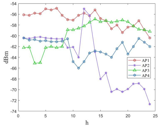 In order to verify the impact of the aforementioned influencing factors on front-end data acquisition, we conducted multiple measurements of four access points (APs) at the field site at different times of the day. The measurement results are shown in Figure 9 below. The measurement results were influenced by the multipath effect caused by the activities of personnel and nonvisual propagation at the field site. The RSSI value of an AP fluctuated significantly at different times, causing the RSSI data values collected at the front end to vary significantly. Thus, the constructed offline dataset did not have localization characteristics.