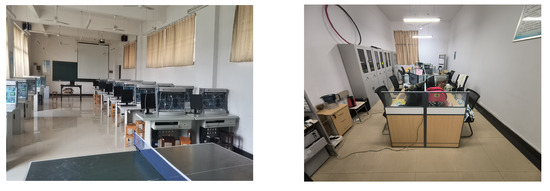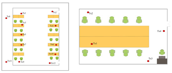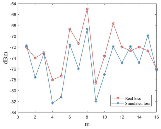 To make the simulated scene as close as possible to the location of the actual room, the sizes and makeups of the items in the room were manufactured to match the path loss incurred in the virtual space. However, in practical scenarios, the materials used for buildings are too complex and the materials available in simulation software are too simple, which makes it impossible to simulate accurately. Moreover, the human activities in the laboratory and the temperature changes throughout the day caused the difference between the actual measurement and the simulation to be within the 3–4 dBm range. As shown in Figure 12, we deployed the same transmitter and receiver in the natural and simulated scenarios. We collected the RSSI values from the same transmitter at a distance of 15 m. The results show that the trend of the actual measured RSSI values was clearly below the simulated values.