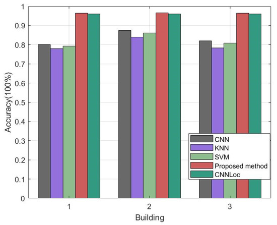 This section compares the accuracy of the proposed method using the UJIIndoorLoc database with the already existing depth model indoor localization framework of CNNLoc and others (shown in Figure 13) to verify that the proposed network outperformed other networks in terms of indoor accuracy. The CNNLoc network was proposed by Song et al. [38] for multibuilding and multifloor indoor localization. Our proposed DS-LocCNN framework was compared with CNNLoc, a traditional CNN, KNN, and an SVM [39,40] concerning the average floor accuracy using the UJIIndoorLoc dataset. As shown in Table 4, the best floor accuracy of the well-performing CNNLoc was 96.03%, and the highest accuracy of the proposed method for floor localization was 96.67%, higher than the well-performing CNNLoc and other localization methods.