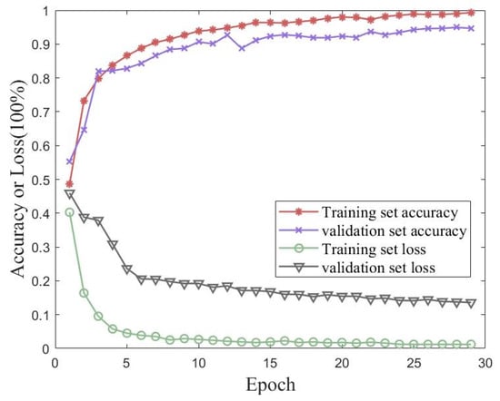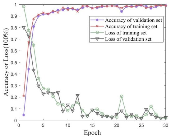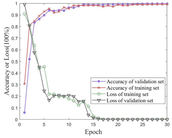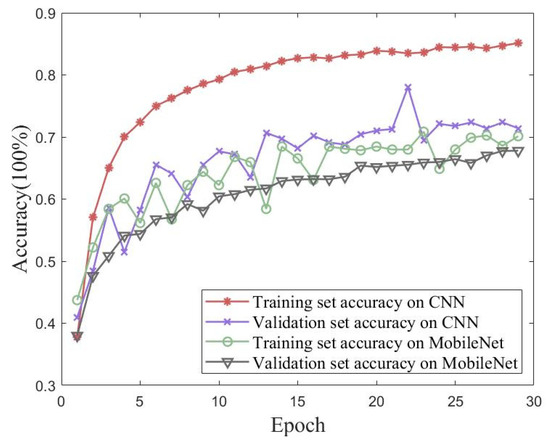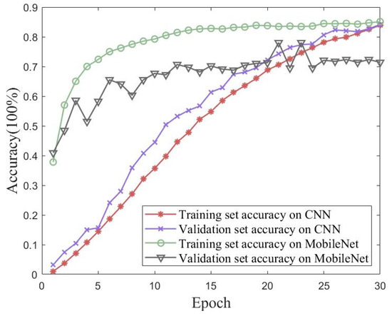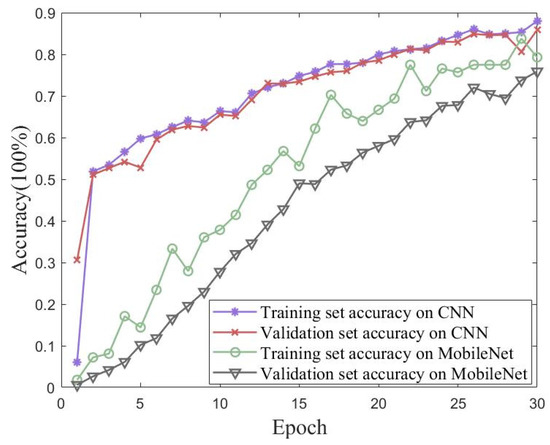 Validation experiments were conducted using a traditional CNN and MobileNet to verify the proposed method’s performance on the measured dataset with iterative accuracy. Figure 18 shows the accuracy and loss of the proposed method for the measured dataset with 30 iterations of training and validation sets. Figure 19 shows the accuracies of the traditional CNN and MobileNet for the measured dataset with 30 iterations of training and validation sets. The best performances of the three methods for the measured dataset are shown in Table 7. The proposed method in this paper achieved an accuracy of 99.10% for the validation set, which was better than the performances of either the traditional CNN or MobileNet.