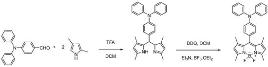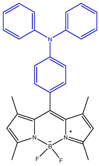 BODIPY derivative 1 functionalized at the meso position with the triphenylamino (TPA) group (Figure 1) was previously synthesized by our research group through two reactional steps at room temperature. The first step involved a condensation reaction of 2,4-dimethylpyrrole and 4-(diphenylamino)-benzaldehyde in dichloromethane (DCM) in the presence of a catalytic amount of trifluoroacetic acid (TFA) to form the dipyrromethane core. The second reactional step consisted of the oxidation of dipyrromethane to dipyrromethene through the addition of a solution of 2,3-dichloro-5,6-diciano-p-benzoquinone (DDQ) followed by a complexation reaction with BF3.OEt2 in the presence of triethylamine (Scheme 1). Finally, the crude residue was purified using petroleum ether/ethyl acetate (4:1) as eluent through a dry flash chromatography column, and the pure compound was obtained as an orange solid with a 16% yield. Through the 1H NMR spectrum, it was possible to confirm the presence of the triphenylamine group at the meso position of the BODIPY core, with the characteristic proton signals appearing in the aromatic zone of the spectrum. Additionally, the signals in the 13C NMR spectrum and the obtained data from mass spectrometry were in agreement with the expected structure [31,32].
