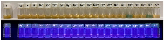 As shown in Figure 2, the compound 1 solution displays a light yellow color in the absence of any cation. However, upon the addition of 50 equivalents of each ion to the compound solution, a clear color change of the solution from light yellow to blue–green in the presence of Cu2+ and Fe3+ was observed, while other cations were unable to induce a perceptible color change. In contrast, compound 1 did not exhibit fluorescence emission variation in the presence of any cation. Additionally, the preliminary chemosensory study of compound 1 in the presence of different anions (H2PO4−, CH3COO−, NO3−, ClO4−, HSO4−, BzO−, Br−, CN−, I−, F−) was also tested, but no optical response was detected.