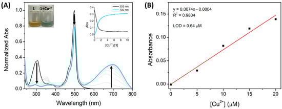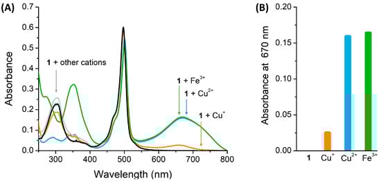 In addition, the absorption spectrum of the compound was plotted in the absence and presence of 10 equivalents of each cation. As depicted in Figure 3A, compound 1 in the absence of ions (in black) shows a maximum absorption band at 497 nm, which corresponds to the light yellow of the compound solution in ACN, and another band at 305 nm, corresponding to the absorption of the TPA moiety [38,39]. The characteristic absorption spectrum of compound 1 suffered significant changes in the presence of 10 equivalents of Cu2+ and Fe3+, with the appearance of a new band around 670 nm. In contrast, the other cations induced either no or a slight change in the compound’s absorption spectrum. In the case of Cu+, the presence of the cation induced the appearance of a new absorption band around 670 nm; however, it does not show a significant absorbance intensity change when compared to Cu2+ and Fe3+ (Figure 3B), which is in agreement with the results from the preliminary chemosensory ability (Figure 2) where no significant change in the color of the solution of compound 1 was observed in the presence of 50 equivalents of Cu+. Moreover, the absorption band that appears around 355 nm in the presence of Fe3+ (in green) corresponds to the self-absorption of Fe3+ [40]. Based on these results, compound 1 shows an interesting potential as a selective colorimetric chemosensor of Cu2+ and Fe3+.