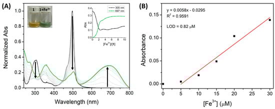 (A) Normalized UV-vis absorption titration of 1 (1 × 10−5 M) with Fe3+ (0–100 μM) in ACN. (The insert represents the normalized absorption at 492 nm as a function of Fe3+ equivalents). (B) The linear relationship between the Fe3+ concentration and the absorbance of 1 (at 697 nm).