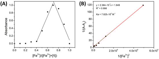 The binding stoichiometry of the complexes 1-Cu2+ and 1-Fe3+ was determined using a Job’s plot [53] with absorption bands at 697 nm and 700 nm, respectively. The corresponding absorbance was plotted as a function of the mole fraction of the cation (Figure 6A and Figure 7A). In both cases, the highest absorbance was reached at cation 0.7 mole fraction, indicating the formation of a 1:2 complex between ligand 1 and metal.
