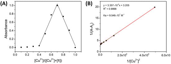(A) Job’s plot of 1-Cu2+ in ACN. The absorbance was recorded at 700 nm. (B) Benesi–Hildebrand diagram from spectrophotometric titration of 1 with Cu2+ at 700 nm.