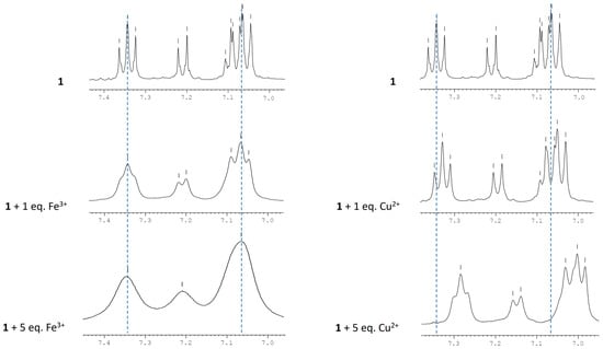 1H NMR spectra of 1 in the presence of increased amounts of Fe3+ and Cu2+ in DMSO-d6.