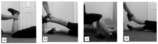 Movements for the sEMG calibration protocol to establish sEMG amplitude thresholds. Movements include prone knee flexion (a), prone hip extension (b), seated knee extension (c), and supine leg raise (d).