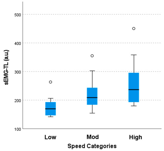 sEMG-TL is presented as a median (interquartile range (IQR)) for each running speed. Figure 3 illustrates the spread of data between each running speed. A low running speed resulted in the lowest median sEMG-TL, 254.17 a.u. (IQR = 148.50 to 204.27 a.u.). A high running speed resulted in the highest sEMG-TL, 236.67 a.u. (IQR = 192.10 to 295.48 a.u.), and the sEMG-TL for a moderate running speed was between those of the low and high speeds, 208.07 (IQR = 183.51 to 244.29 a.u.). The Kruskal–Wallis one-way analysis of variance by ranks test revealed a significant difference in sEMG-TL among the three running speeds, χ2(2) = 11.50, p < 0.05. Post hoc pairwise comparisons using the Dunn–Bonferroni test demonstrated that the sEMG-TL at a low running speed was significantly different from both the moderate and high running speeds (adjusted p < 0.05), but no statistical difference was established between moderate and high running speeds (adjusted p > 0.05).