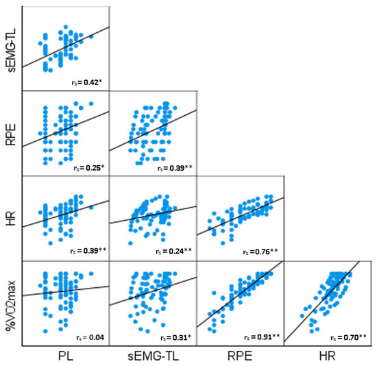Scatterplot matrix of associations between variables: %O2max = percentage of maximum oxygen uptake; sEMG-TL = surface electromyography training load; RPE = rating of perceived exertion; HR = heart rate; PL = PlayerLoad. Each blue dot corresponds to individual measurements at each one-minute stage during the treadmill running test. Solid lines are the least-squares derived best-fitting lines. * p < 0.05; ** p < 0.01.