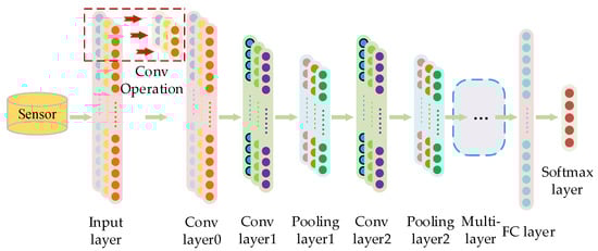 A CNN is an important part of a deep neural network, which consists of trainable multilevel architecture and is widely used for its good feature extraction ability. A CNN generally consists of five modules: input layer, convolutional layer, pooling layer, fully connected layer, and output layer. The 1DCNN can process and retain the original data characteristics. Each stage of the 1DCNN contains a pooling layer and a convolutional layer. As shown in Figure 1, the fault features are extracted by multi-stage alternating operations, and faults are classified by the fully connected layer and classifier.
