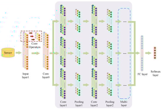 Therefore, based on the basic principle of a CNN, a multi-scale 1DCNN is proposed in this paper. The structure of the multi-scale 1DCNN is shown in Figure 2. Using the original time-domain signal as input, data abstracted from their original source can be effectively learned, while the original characteristic signal detected by the sensor is preserved. The sensor signal is preprocessed by the input layer and then input into the multi-scale 1DCNN. To obtain larger features, the first layer uses a large convolution kernel in the model. After the first convolutional layer, three scale branches are set and different sizes of three convolution kernels are used to convolute the signal in parallel. Each branch includes a multi-level pooling layer and convolutional layer to achieve signal feature extraction with different scales of fineness, thus improving the accuracy of the diagnostic. Finally, the features extracted from the three scales were flattened, then input into the fully connected layer for classification.