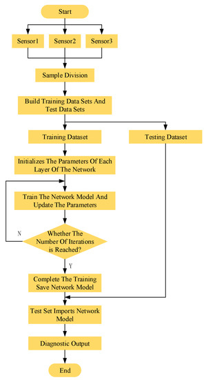 The fault diagnosis of the mechanical equipment was performed by constructing a 1DCNN model. Figure 4 shows the training flow diagram of the network model. For multiple measurement points of the system, one-dimensional signals of the mechanical equipment at different faults were measured by a variety of sensors. These one-dimensional signals are classified according to different faults and training sets. The testing sets are divided by all labeled data, as input into the 1DCNN model. By initializing the network parameters and selecting the optimal batch size and learning rate, the training set is input for self-learning. The trained 1DCNN is then verified by the testing set for identifying and classifying device faults.