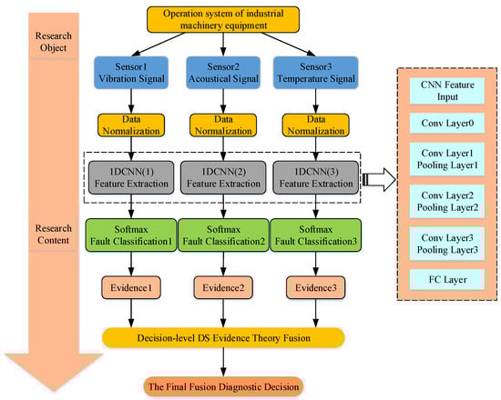With the development of modern industry, there are many kinds of equipment and complex gears. The performance changes caused by faults in different devices, components, and locations are different, so it is necessary for multiple sensors to detect different data for decision making. Because of the incompatibility of data, traditional methods cannot be combined at data level and classifiers are not suitable for all data types. Therefore, data must be classified individually, combined with the classification results, to obtain accurate decision results. In view of this, a CNN combined with the DS evidence theory, this paper researches the fault diagnosis method with operable multi-sensor fusion. By using 1DCNN to classify data from different sensors in parallel and combining DS combination rules for optimization, fault information is obtained from mechanical devices. The main contributions of the proposed method include the following: methods of fault diagnosis based on 1DCNN network are adopted, and the multi-scale parallel processing of different sensor data is used to solve the task requirements under different working conditions. Compared with other methods, there is faster detection efficiency. Moreover, improved DS evidence theory is combined with the 1DCNN network so that the detection efficiency in fault isolation is higher and the accuracy of fault classification is improved.