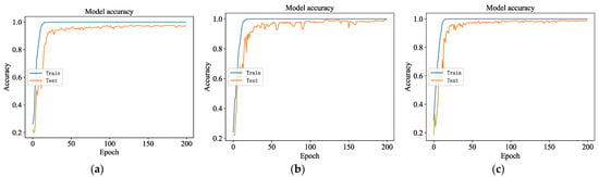 Accuracy in the training process. (a) Accuracy of vibration sensor; (b) accuracy of acoustic sensor; (c) accuracy of temperature sensor.