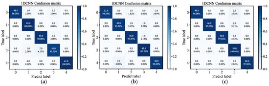 Confusion matrix for fault diagnosis. (a) Confusion matrix of vibration sensor; (b) confusion matrix of acoustic sensor; (c) confusion matrix of temperature sensor.