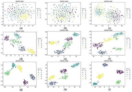 To more intuitively study the classification effect of flash furnace states in each layer of the CNN, the T-distributed stochastic neighbor embedding (t-SNE) algorithm is used to visualize model output signals in two dimensions, as shown in Figure 9. Each feature is essentially separated and aggregated and has a good clustering effect. Finally, the five types of states can be well identified, with obvious linear boundaries.