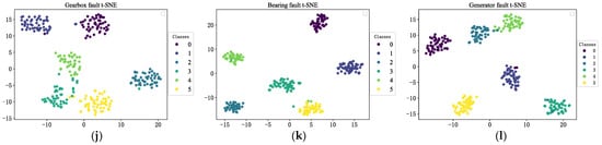 t-SNE dimensional reduction visualization. (a) t-SNE of original vibration signal; (b) t-SNE of original acoustic signal; (c) t-SNE of original temperature signal; (d) t-SNE of single scale vibration signal; (e) t-SNE of single scale acoustic signal; (f) t-SNE of single scale temperature signal; (g) t-SNE of multi-scale vibration signal; (h) t-SNE of multi-scale acoustic signal; (i) t-SNE of multi-scale temperature signal; (j) t-SNE of gearbox fault; (k) t-SNE of bearing fault; (l) t-SNE of generator fault.