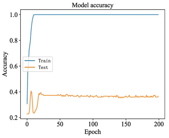 The accuracy and loss values of the 1DCNN network model in the training process are shown in Figure 6 and Figure 7. As the iteration times increase, the accuracy curve is on an upward trend, while the loss curves are on a downward trend; the model performance becomes better and better. After several iterations, in the training set, the model’s loss value finally approaches zero, and the recognition accuracy reaches 100%. In the test set, the model’s loss value gradually decreases and then remains in a state of fluctuation. The recognition accuracy increases rapidly, from about 20% at the beginning, and then stabilizes gradually. The highest recognition accuracy during the training process was 98%, with about 30 iterations.