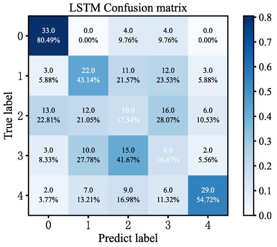 Figure 11 shows the confusion matrix. From Figure 11, there are 33 correct predictions in the category of state 0, which corresponds to 80.49%. Of the predictions in the state 1 category, 22 were correctly predicted, which corresponds to 43.14%. Of the predictions in the category of state 2, 10 were predicted correctly, which corresponds to 17.54%; of the predictions in the category of state 3, 6 were predicted correctly, which corresponds to 16.67%; of the predictions in the category of state 4, 29 were predicted correctly, which corresponds to 54.72%. From the test results, the LSTM model cannot effectively identify the five states of the flash furnace.