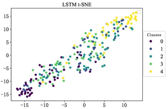To more intuitively study the classification effect of flash furnace states in the LSTM model, the T-distributed stochastic neighbor embedding (t-SNE) algorithm is used to visualize model output signals in two dimensions, as shown in Figure 12. The individual features are not completely separated and aggregated; the clustering effect is small. Finally, the five types of fault conditions are not separated, so the recognition effect of the model is low.