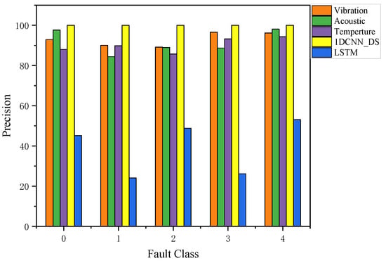 Precision indicates how many positive class predictions are generated from positive samples: it represents the proportion of samples that are truly positive among those identified as positive by the model. Figure 13 can be used to compare the precision of all the results, including the precision of vibration, acoustic, and temperature signals after the multi-scale 1DCNN model, as well as the precision of the LSTM model and DS fusion. A model’s effect is generally better the higher its accuracy. As shown in Figure 13, a higher level of precision is achieved with 1DCNN and DS (1DCNN_DS) fusion than with the other methods. The average precision of 1DCNN_DS is 0.9934, which can meet the requirements of anomaly detection for complex industrial systems.