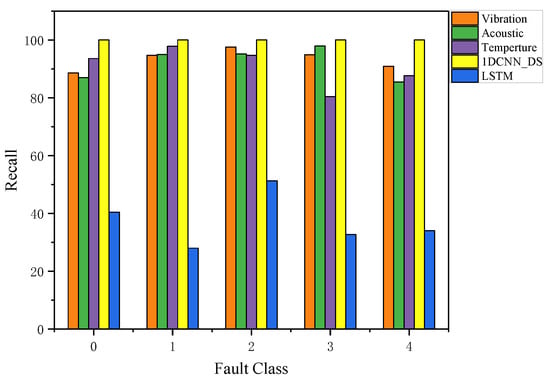 In the dataset, recall indicates all of the positive samples which made positive predictions. It represents the ratio of positive samples identified by the model to all positive samples. Figure 14 can be used to compare the recall of all the results, including the recall of vibration, acoustic, and temperature signals after the multi-scale 1DCNN model and the recall of the LSTM model and DS fusion. A model’s effect is generally better the higher its recall. As shown in Figure 14, a higher level of recall is achieved with 1DCNN_DS fusion than with the other methods. The average recall of 1DCNN_DS is 0.9884, which is a normal and acceptable result.