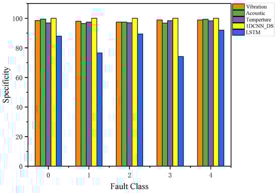Specificity indicates the ratio of negative class samples the model identifies to all negative class samples. Figure 15 can be used to compare the specificity of all the results, including the specificity of vibration, acoustic, and temperature signals after the multi-scale 1DCNN model and the specificity of the LSTM model and DS fusion. A model’s effect is generally better the higher its specificity. As can be seen from Figure 15, a higher level of specificity is achieved with 1DCNN_DS fusion than with the other methods. The average specificity of 1DCNN_DS is 0.9947, which is a normal and acceptable result.
