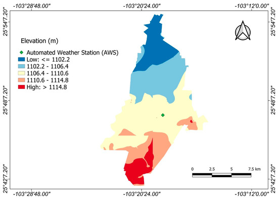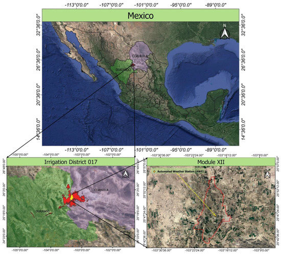 The AWS belongs to Centro Nacional de Investigación Disciplinaria en Relación Agua, Suelo, Planta, Atmósfera (National Center for Disciplinary Research on Water, Soil, Plant, Atmosphere; CENID RASPA) of Instituto Nacional de Investigaciones Forestales, Agrícolas y Pecuarias (National Institute of Forestry, Agricultural, and Livestock Research; INIFAP), within the facilities of an agricultural production unit located at Module XII of the Lagunera Region Irrigation District 017, at 1110 m a.s.l. and coordinates 25°47′00.32″ N, 103°18′46.54″ W (Figure 1).