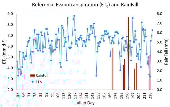 Crop evapotranspiration (ETC) is a crucial aspect of the water balance in agricultural areas. To estimate it, the most accessible method is to estimate reference evapotranspiration (ET0) and then pair it with crop and soil coefficients [8]. Reference evapotranspiration (ET0) is the evapotranspiration rate of a hypothetical reference crop (grass or alfalfa) with a height of 0.12 m, a fixed surface resistance of 70 s m−1, and an albedo of 0.23, homogeneous, well-watered, free from diseases and pests, growing vigorously, and providing complete shade to the soil [9,10,11]. ET0 measures atmospheric evaporation demand regardless of crop type, development, and management practices [12,13]. This variable is affected only by climatic factors [14] and can be calculated from meteorological data [10].