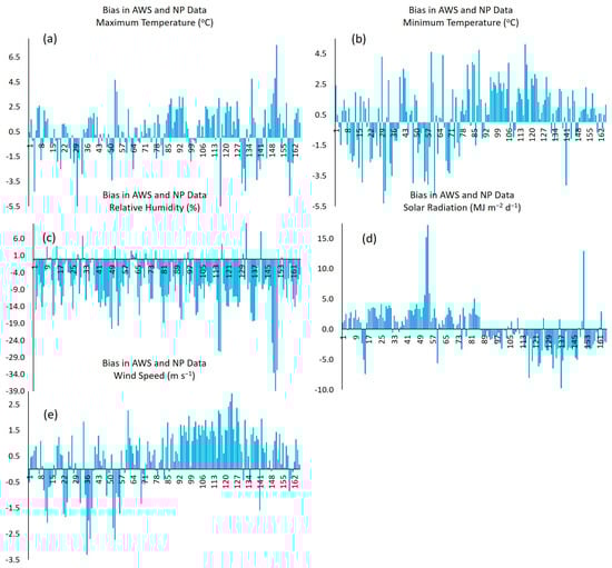Bias between observed (AWS) and reference (NP) data for the meteorological. (a) Bias in AWS and NP Data Tmax. (b) Bias in AWS and NP Data Tmin. (c) Bias in AWS and NP Data RH. (d) Bias in AWS and NP Data SR. (e) Bias in AWS and NP Data WS.
