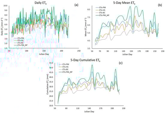 Different ways to estimate ET0 using empirical equations and the reference method (PM) during the study period. (a) Estimation Daily ET0. (b) Estimation 5-Day Mean ET0. (c) Estimation 5-Day Cumulative ET0.