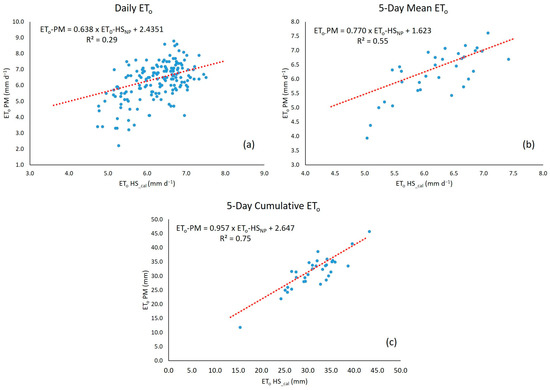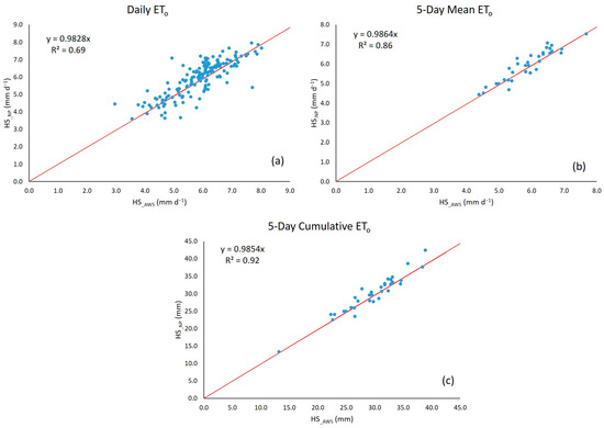 The comparison of ET0 estimates with the HS equation using temperature data recorded by the AWS (HSAWS) and from the NP platform (HSNP) yielded a high correlation for the three estimates (Figure 7); the 5-day cumulative ET0 recorded the highest R2. These R2 values indicate the feasibility of estimating ET0 using the NP platform’s temperature data and the HS formula [27,71,76].