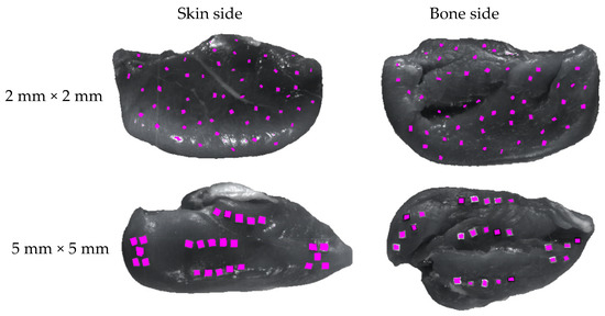 Waveband images of the skin (left) and bone (right) side of a fillet at 1000 nm with contaminated foreign materials (magenta color) in two different sizes.