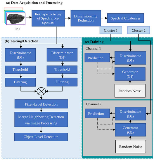 Schematic of the proposed FM-detection method, encompassing (a) hyperspectral data acquisition and preprocessing, (b) inferencing (testing) and FM detection, and (c) individual GAN-channel training.