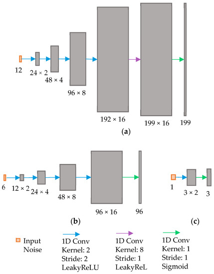 Figure 3 and Figure 4 show the architectures of the GAN generators and discriminators used in this study. The input layer size was adjusted to accommodate the different dimensionalities of the SWIR (n = 199) and NIR (n = 96) and PCA (n = 3) spectral data. Note that the NIR spectral input vector was padded with one zero to make the length of the input layer 96 (Figure 3b and Figure 4b). Each generator consisted of an input layer, multiple 1D convolution layers with ReLu activation, and the last layer of the 1D convolution with sigmoid activation.