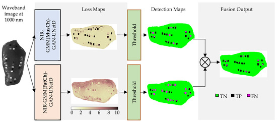 The specific objectives of this study are (1) to develop a semisupervised GAN model for FM detection by incorporating a 1D U-Net discriminator into the GAN model, (2) to improve the FM-detection performance by training two independent GAN models for spectral signatures unique to the muscle tissue and fatty tissue in chicken meat, and (3) to conduct a comparative analysis of the model’s performance by using different wavelength ranges. Additionally, the main contributions of this paper are as follows: (1) a semisupervised training strategy eliminated the need for FM data collection during the training of the FM-detection models, (2) NIR HSI (1000–1700 nm) was combined with the DL-based multichannel GANs and a 1D U-Net GAN discriminator, and (3) the outputs of the 1D spectrum-based GAN model were aggregated and spatially mapped onto a 2D prediction image to allow for FM detection at object and image levels.