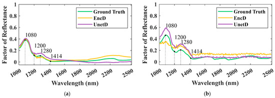 Second, Figure 6 shows the mean SWIR spectra generated by two GAN models with different discriminators (UnetD and EncD), each trained with clustered muscle (Figure 6a) and fat (Figure 6b) spectral groups. The synthetically generated data were compared with the ground-truth spectra. For the muscle spectral group, both the UnetD-based and EncD-based GAN models showed similar mean spectral responses to the ground truth from 1000 nm until approximately 1700 nm, with slight deviations in reflectivity compared to the ground truth mean spectrum between 1700 and 2500 nm. In the case of the fat spectral group, the UnetD-based GAN model outperformed the EncD-based model as it better captured the peaks and troughs at key wavelengths such as 1800, 1200, 1280, and 1414 nm. It is worth noting that the key NIR wavelengths at 1080 nm and 1414 nm are related to the water present in the meat samples, and 1200 nm and 1280 nm correspond to the C-H stretching modes from the lipid molecules within the meat samples. Compared to the muscle spectral clustering group, the quality of the generated spectra for the fat spectral sample clustering group was lower due to (1) the imbalance in the number of spectra between the muscle (high) and fat (low) groups and (2) the large spectral heterogeneity in the reflectivity of the fat class samples used for the clustering and GAN model training. It is also worth mentioning that, in the case of the fat data channel, the UnetD was more sensitive to variations across the bands compared to the EncD, which is why it forced the generator to better generalize the data, resulting in samples with less noise and more prominent peaks and troughs. The addition of the U-net decoding portion and local detection likely contributed to this improved smoothness shown in Figure 6b. In summary, the UnetD-based GAN model produced smoother and more accurate mean spectra compared to the EncD-based GAN model. The generated data at key wavebands also showed a closer similarity to the ground truth when NIR data were utilized.