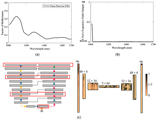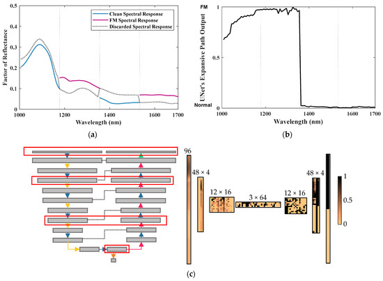 Localized detection power and layers of NIR-UnetD. (a) Input: a normal pixel’s spectrum; (b) output of UnetD’s expansive path in the decoder: localized prediction across the NIR wavelength range (0: clean, 1: FM); and (c) visual representation of intermediate layers. Note that the bandwise localized predictions were combined with the global prediction of the contracting path at the bottleneck in the last layer of the discriminator to predict the final loss value.