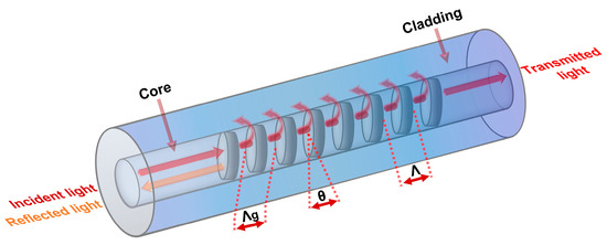 The schematic of a typical TFBG structure is displayed in Figure 1. Similar to conventional FBG, the Bragg resonance in the TFBG core forms as the light coupling occurs in the forward- and counter-propagating core modes. However, the presence of tilted planes results in the excitation of cladding modes and the interaction between the forward-propagating core modes and the counter-propagating cladding modes leads to resonance. The core-cladding mode resonance is usually analyzed in transmission mode owing to the significant attenuation of cladding modes in reflection mode. Furthermore, the evanescent field of the guided modes in cladding interacts with the ambient environment, thereby changing their effective indices and subsequently changing the resonance spectrum. The resonance wavelength of the Bragg condition and cladding modes () can be as expressed as in [33].