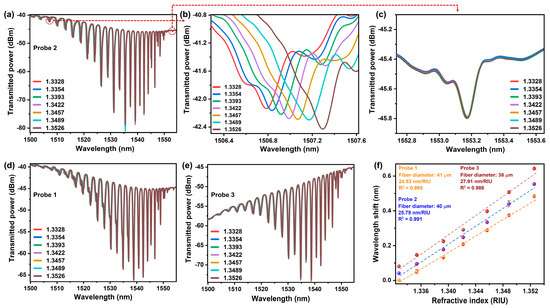 The response of the bare ETFBG to varying RI of glycerine solution was investigated to ascertain its efficiency towards the ambient environment. Several solutions with RI ranging from 1.3328 to 1.3526 were prepared by mixing glycerine with DI water and the RI of each solution was determined using a handheld digital refractometer (Reichert AR200, New York, NY, USA). Figure 3a illustrates the spectral response of ETFBG to a change in the RI of the solutions at room temperature and the zoomed view of the red shift of one of the minima corresponding to cladding mode resonance is shown in Figure 3b. This type of movement can be attributed to the change in the effective index of cladding modes due to the interaction of the evanescent field of the cladding modes with the specific RI solution. On the other hand, the minima corresponding to Bragg resonance remain insensitive towards the change in RI of solutions, as displayed in Figure 3c. Therefore, this minimum can be utilized to detect temperature as well as maintain the straightness of the probe by monitoring the strain induced by the mechanical setup. It can be noted that the amplitude of the Bragg resonance dip is lower compared to conventional FBG because of the limited light propagation in the core. Repeating the above procedure under the same environmental conditions, another two probes were also fabricated, with their diameter being 41 μm (probe 1) and 38 μm (probe 3), which were slightly different that of from probe 2 (diameter = 40 μm). All these probes with different diameters were investigated for RI sensing (see Figure 3a,d,e). As can be observed from Figure 3f, the average sensitivity of probe 1, probe 2 and probe 3 was calculated to be 24.53 nm/RIU, 25.79 nm/RIU and 27.91 nm/RIU, respectively.