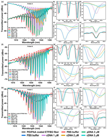 In this research, the spectrum corresponding to ETFBG coated with PEI/PAA (probe A, diameter = 40 μm) was recorded using the aforementioned experimental setup, as shown in Figure 6a. The coated fiber was then immersed in a PBS buffer solution for a few minutes to clean any additional contaminants from the fiber surface. Upon immersion, the spectrum exhibited a red shift due to the increase in the RI of the ambient environment as illustrated in Figure 6b. Subsequently, the PBS-treated probe was again dipped into a pDNA-based solution with 3 μM concentration and this led to the attachment of pDNA to the PEI/PAA coating layer. As can be seen in Figure 6b, the interference minima shifted towards the longer wavelength as the pDNA became immobilized. The probe was again washed with PBS to remove the unaffiliated pDNa, resulting in a blue shift of the transmission minima corresponding to cladding mode resonance. Afterwards, the pDNA-treated ETFBG was submerged into solutions of cDNA, with concentrations ranging from 1 μM to 3 μM to determine sensor sensitivity.