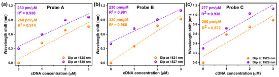 The above investigations were repeated for probe B (diameter = 38 μm) and probe C (diameter = 36 μm) under identical conditions, and the results were plotted in Figure 6f–j and Figure 6k–o, respectively. The wavelength shift in transmission minima corresponding to all these probes due to changes in cDNA concentrations is summarized in Figure 7a–c. As can be seen in these figures, the sensitivity of probe A, probe B and probe C corresponding to two different transmission minima was found to be 260 pm/μM and 230 pm/μM, 320 pm/μM and 230 pm/μM and 286 pm/μM and 277 pm/μM, respectively. It can be easily noticed from the results that the transmission minima corresponding to higher-order cladding mode is more sensitive to DNA hybridization due to the higher spatial distribution of these modes in comparison to lower-order modes [36]. The slight variation in sensitivity could be attributed to the variation in diameter of the ETFBG and the slight variation in thickness of the PEI/PAA coating layer. Furthermore, the detection accuracy of the sensor with maximum sensitivity (probe B) was also investigated. The limit of detection (LOD) of the sensor was found to be 0.65 μM according to the following equation: LOD = 3σ/S, where σ (σ = 0.071 nm) and S refer to the standard deviation and sensitivity of probe B, respectively. The average quality factor (Q) and the figure of merit (FOM) were also calculated as 1.12 × 103 and 0.24 utilizing the equation λ/∆λFWHM and SQ/λ, respectively, where λ is the resonance wavelength and ∆λFWHM is the full-width-half-maximum linewidth of the resonance wavelength. Furthermore, the performance of the proposed sensor compared with other DNA sensors is presented in Table 1.