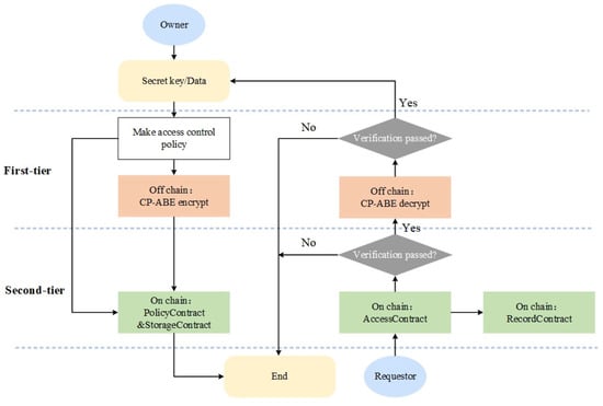 - To propose a dual-layer attribute-based auditable access control model. The first tier utilizes the CP-ABE algorithm for data access control, while the second tier employs smart contract optimization and coordination for access control, ensuring the auditability of access records. This method enables flexible access control policies under ciphertext, reduces the risk of plaintext transmission, and guarantees the privacy of data sharing processes.