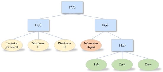 - : The DO utilizes this algorithm to encrypt the AES key and incorporate the access policy <EncPolicy> into the ciphertext CK. Initially, the algorithm assigns a polynomial to each node in <EncPolicy>, following a top-down approach, where the degree of is defined as . Commencing from the root node , a random selection is made; let . For the remaining nodes , let . The leaf node set is denoted as . The ciphertext, which encapsulates the access policy <EncPolicy>, is represented as follows: