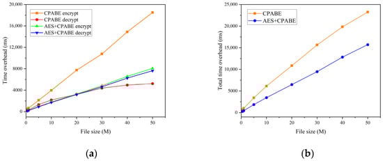 - When exclusively utilizing the CP-ABE algorithm, the encryption and decryption times exhibit a linear increase as the file size increases. In contrast, the proposed hybrid encryption scheme demonstrates nearly constant time overhead. This is because the encryption and decryption time of the CP-ABE algorithm is combined with the complexity of the access structure. When employing the CP-ABE algorithm for encryption and decryption, calculations and searches are required for each attribute, significantly increasing the workload of bilinear pairing operations and resulting in a linear increase in time with the number of attributes. However, the hybrid encryption scheme combines the advantages of symmetric and asymmetric encryption. It leverages efficient symmetric encryption for data encryption and asymmetric encryption for encrypting the symmetric key. As the number of attributes increases, this hybrid encryption scheme effectively reduces the encryption and decryption time because the key length remains fixed and shorter compared to the original data length. The additional time overhead caused by an increase in attributes can be considered negligible.