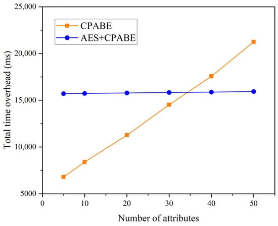 - In the second set of experiments, we maintained a file size of 50 M and varied the total number of attributes to 5, 10, 20, 30, 40, and 50. Tests were conducted to compare the overall time overhead of CP-ABE and AES + CP-ABE hybrid encryption, as illustrated in Figure 7. Based on the experimental results: