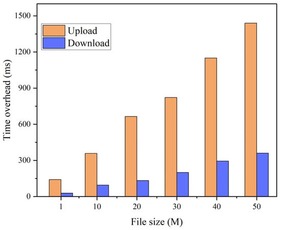 - In the third set of experiments, we varied the sizes of the original files, namely 0.5 M, 1 M, 5 M, 10 M, 20 M, 30 M, 40 M, and 50 M. We conducted tests to assess the upload and download performance of the IPFS file system, with time serving as the evaluation metric. The experimental results are depicted in Figure 8. Based on these findings: